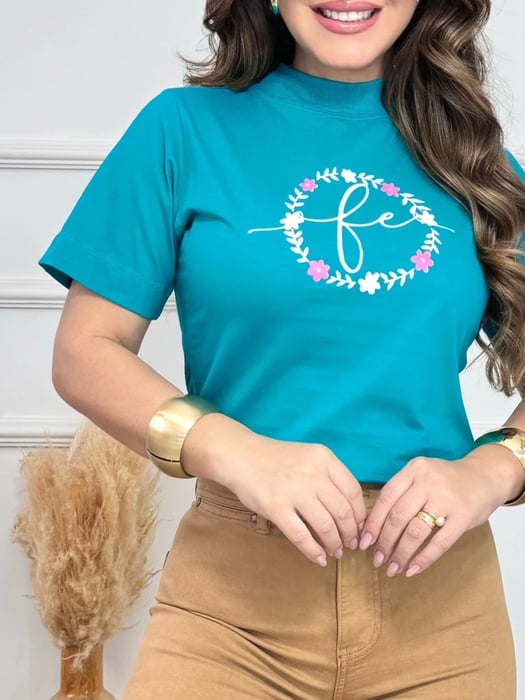 T-SHIRT GOLA ALTA FÉ COM DETALHES DE FLORES